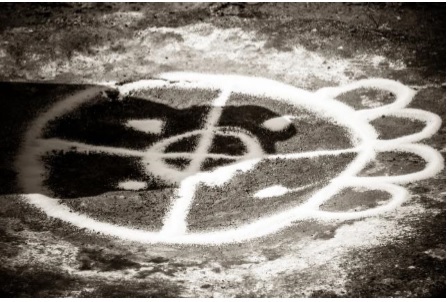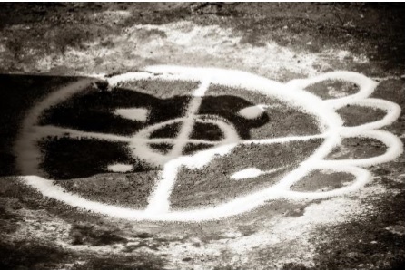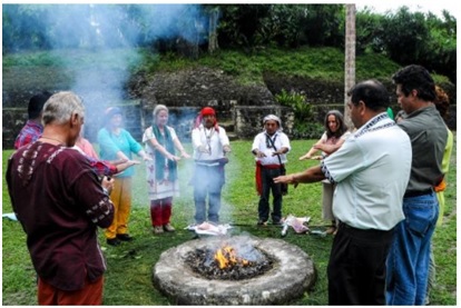 El Altar sagrado, lugar de ceremonias. Los antiguos mayas pensaban que existían ciertos puntos específicos donde la energía del universo se concentraba. Ahí construyeron sus ciudades y en el centro de las plazas asentaron pesados círculos de piedra y los nombraron lugares sagrados, idóneos para oficiar ceremonias. En el primer paso del ritual, el guía invoca a las cuatro esquinas del universo y a los cuatro árboles que sostienen la bóveda celeste según la cosmovisión Maya (los puntos cardinales) encerrados en un círculo. El número 4 representa también los colores del maíz, alimento sagrado de los mayas, que fue también la base de sus grandes avances astronómicos y la configuración de su calendario. Si sumamos todos los elementos encerrados en el círculo comprobaremos que el resultado es 13, número sagrado maya.
