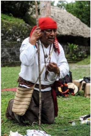 El Ajq’ij, el Sacerdote Maya. La palabra Ajq’ij proviene del idioma quiché y significa ‘contador de los días’. Es el guía espiritual, la persona encargada de llevar a cabo la ceremonia. Representa la sabiduría y tiene la capacidad de interpretar las señales del fuego, los mensajes del Ajaw y los ancestros. El guía se distingue de los demás miembros por el uso del Sut, un paño con el que cubre su cabeza, y el Pas o banda roja con que ciñe su cintura. Estos dos elementos de su vestimenta sirven para equilibrar sus energías durante las ceremonias. El color rojo representa la claridad, la fuerza.